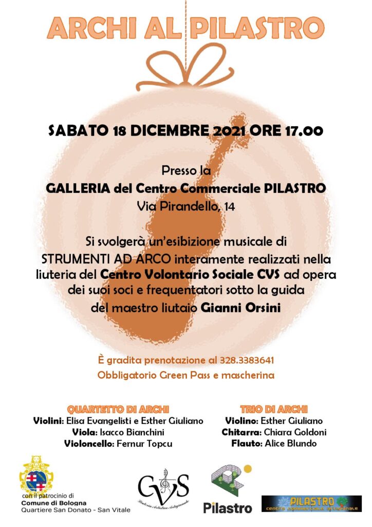 Sabato 18 dicembre 2021 alle ore 17 presso la Galleria del Centro Commerciale Pilastro (Via Pirandello, 14) si tiene un’esibizione musicale di strumenti ad arco interamente realizzati nella liuteria del Centro Volontario Sociale CVS ad opera dei suoi soci e frequentatori sotto la guida del Maestro liutaio Gianni Orsini.